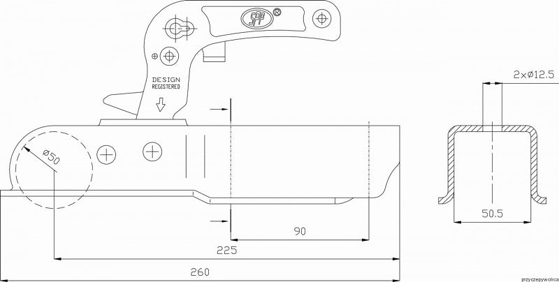 Určený pre montáž na jaklové oje priemer 50 x 50 mm max. celková hmotnosť prívesu: 1300 kg max. zvislé zaťaženie:...