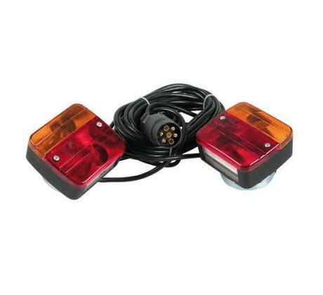 Sada návesových svetiel prívesu Pronto-fari, schválenie 12 V. ECE - 2 magnetické zadné svetlá. - 4 funkcie: blikač, jazda, brzda, osvetlenie ŠPZ - prepojovací kábel 2,5 m medzi dvoma svietidlami - napájací kábel 7,5 m - 7-kolíková zástrčka - Vrátane žiaroviek (1x): P21W, P21 / 5W Toto svetlo sa dá namontovať na vozidlá a prívesy, ktoré jednoducho nahradia 12 V žiarovku za rovnocennú pri 24 V