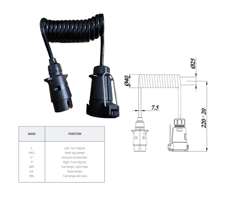 Predlžovací špirálový kábel s plastovou 7 pol.zástrčkou a 7 pol.káblovou zásuvkou . napätie 12 V dĺžka káblu 0,75 m dĺžka...