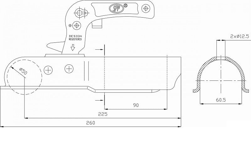 Určený pre montáž na trubkové oje priemer 60 mm. max. celková hmotnosť prívesu: 1300 kg max. zvislé zaťaženie: 100 kg...